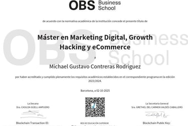 Máster en Marketing digital, Growth Hacking y e-Commerce OBS Business School, Avalado por Universidad de Barcelona Marzo 2024 - Abril 2025