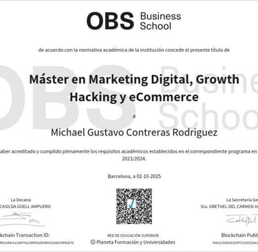 Máster en Marketing digital, Growth Hacking y e-Commerce OBS Business School, Avalado por Universidad de Barcelona Marzo 2024 - Abril 2025